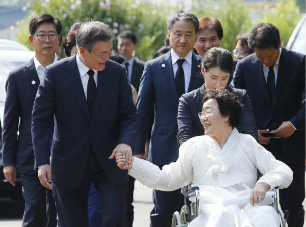 图说:当地时间2018年8月14日,韩国总统文在寅出席日军“慰安妇”受害者纪念仪式。视觉中国