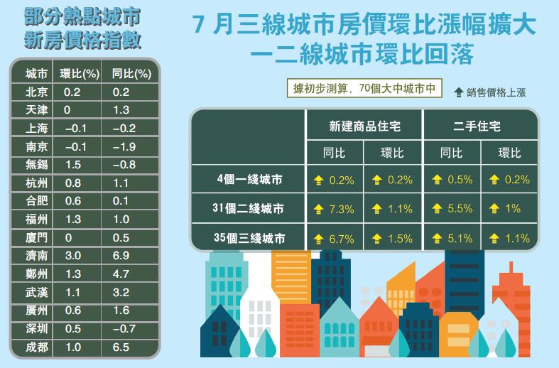昨日,國家統計局發布了7月份70個大中城市商品住宅銷售價格變動情况統計數據。與上月相比,價格上漲的城市達到65個,集中在二三線城市,下降的城市僅有3個,持平的城市有2個。專家表示,目前房地產市場的回暖跡象與棚改貨幣化的餘溫,以及貿易戰造成的陰影有關,近來房地產市場的漲勢有回暖跡象,可以預計下半年的調控還會加碼。香港商報記者伍敬斌