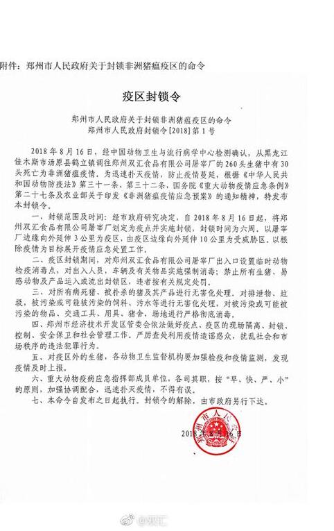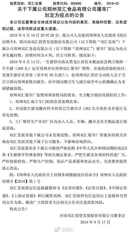 关于下属公司郑州双汇食品有限公司屠宰场划定为疫点的公告: