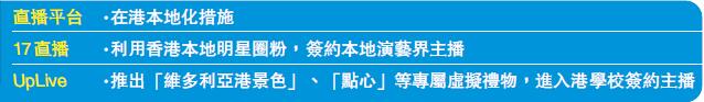 港人常用的Facebook、 YouTube、Instagram、Twitch等網絡社交平台皆開發了直播功能,在香港皆相當受歡迎。台灣的手機直播平台17直播在香港亦積累了不少用戶,去年年底更是宣布正式落地香港成立分公司,繼日本市場之後,開啟擴張第二站。17直播在香港主打「明星效應」,剛剛進入香港時,17直播就已經和本地250名主播主簽約,其中有近四成都是曾經拍攝戲劇、廣告或是出片的演藝界主播,號稱營收成長超過兩倍。