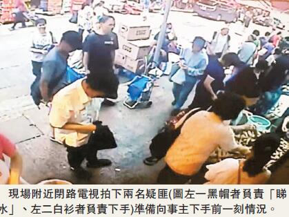 「剪鏈黨」犯案經過,全程被現場店舖閉路電視拍下。前日早上10時許,姓梁女事主(56歲)到觀塘瑞和街及崇仁街交界街巿一間菜檔買,當時現場人多擠迫,梁婦與其他人肩摩肩一起埋首選購蔬果,其間2名男子看中「獵物」,遂一起走到梁婦身後裝作湊熱鬧,其中一人從右邊褲袋中取出小剪鉗,左手就用布袋掩護,約8秒剪斷梁婦的金手鏈,而同黨就站在旁邊遮擋及「睇水」。