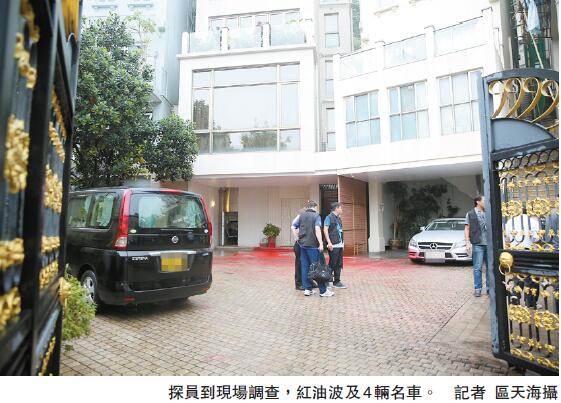 【香港商報网訊】記者區天海報道:港島渣甸山白建時道豪宅遭人投擲「紅油彈」,昨晨保安員發現4輛停泊在大廈地下的名車車頭均沾上紅油,地上更有大攤紅油漬遂報警,警員調查發現豪宅附近一條路牆壁有人曾貼上追債海報,內容聲稱時富金融及實惠母公司時富投資主席關百豪,疑涉及股票爭議及欠債,未料約1小時後,葵涌葵盛圍聖公會林護紀念中學門口大閘被淋紅油,因關百豪為該中學舊生,警方現將兩案列作刑事毀壞和合併調查。