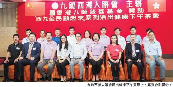 【香港商報网訊】記者郭天琪、呂明霞報道:由九龍西潮人聯會主辦,「香港九龍慈善基金」贊助的「西九全民動起來」系列--活出健康下午茶聚昨日假紅磡海逸皇宮舉行,九龍社團聯會健康大使陳凱欣為參與茶聚的逾千位市民帶來了「健康小錦囊」,呼吁大家多做運動,保持環境衛生清潔,并帶領大家做「長者椅上操」。