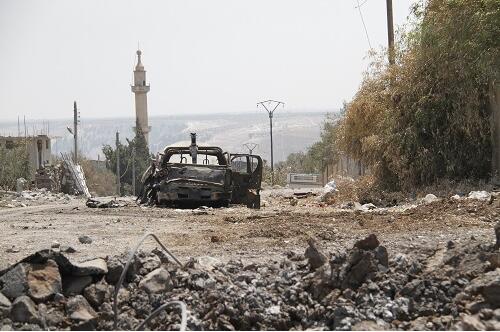 这是2018年8月8日在叙利亚南部耶尔穆克谷地地区拍摄的叙政府军与武装分子激战后损毁的汽车。 新华社