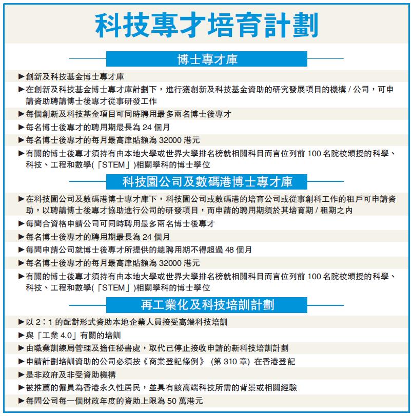 行政長官林鄭月娥去年在《施政報告》中提出,創科局會預留5億元啟動「科技專才培育計劃」,目的是要訓練和匯聚更多科技人才,鼓勵他們在創新和科研方面發展。昨天啟動的「博士專才庫」企劃,旨在資助企業聘用創科博士后專才,從事科研及產品開發等工作。同時,會以配對形式資助本地企業人員接受先進制造技術,尤其是「工業4.0」的培訓,為推動「再工業化」注入動力。