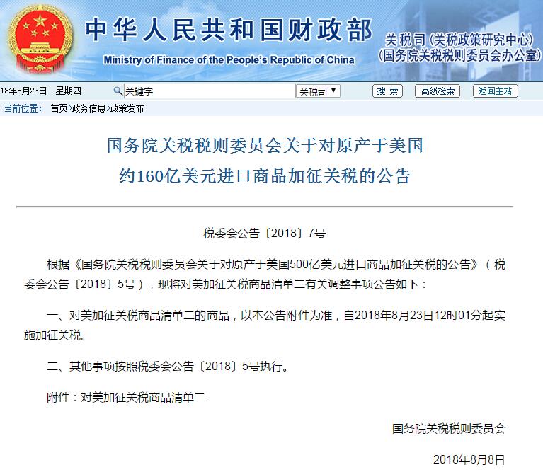 从财政部官网获悉,经国务院批准,国务院关税税则委员会决定对《国务院关税税则委员会关于对原产于美国500亿美元进口商品加征关税的公告》(税委会公告〔2018〕5号)中对美加征关税商品清单二的商品作适当调整后,自2018年8月23日12时01分起实施加征25%的关税。
