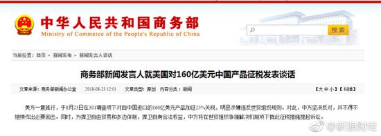 商务部表示,美方一意孤行,于8月23日在301调查项下对自中国进口的160亿美元产品加征25%关税,明显涉嫌违反世贸组织规则。对此,中方坚决反对,并不得不继续作出必要回击。同时,为捍卫自由贸易和多边体制,捍卫自身合法权益,中方将在世贸组织争端解决机制项下就此征税措施提起诉讼。