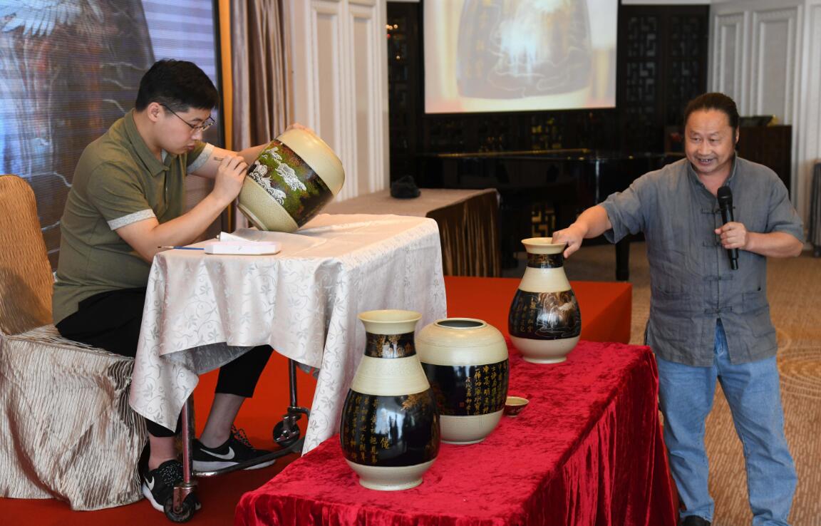 漆藝大師鍾宏雲介绍以「黃大仙文化」为主题的瓷器,其爱子在现场繪製「黃大仙叱石成羊」的傳說。