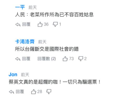 不出意外的是,蔡英文再一次向国际社会“告洋状”,妄称“大陆破坏国际秩序,已经造成全球局势高度不稳定”,并叫嚣“这不再是两岸之间的问题,已不容姑息。”对此,岛内网友表示,“所以‘断交’是国际社会的错吗”“蔡英文所作所为已不容百姓姑息”。