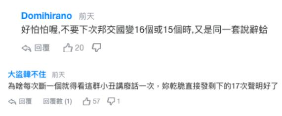 还有网友称,“不要下次‘友邦’变成16个或15个时,又是同一套说辞”“为啥每次断一个就要看这群小丑讲废话一次,你干脆直接发剩下的17次声明好了”。