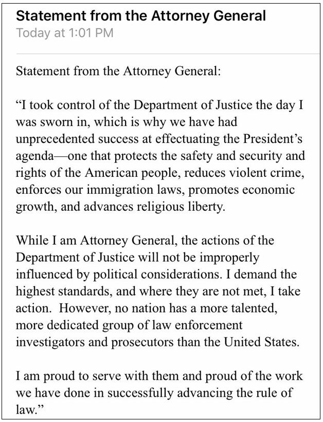 “只要我还是司法部长,司法部的行动就不会受到政治考量的不当影响……没有任何一个国家拥有比美国更有能力、更专注的执法调查人员和检查官小组。我很自豪能为他们服务,为我们成功推进法治所做的工作感到骄傲。”