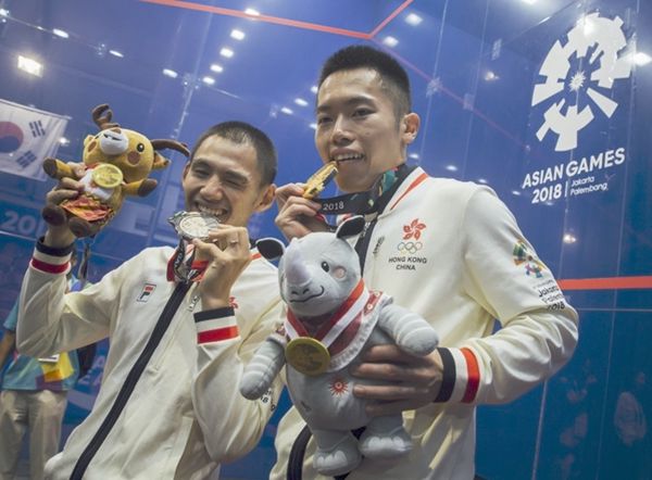 亞運壁球男單賽事,港隊歐鎮銘(右)與李浩賢(左)包攬金銀牌。