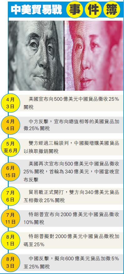 今年7月6日貿易戰明顯升級,中美之間互相對價值340億美元的進口商品加徵25%的關稅,同時還有160億美元的商品清單擇日徵收關稅。7月10日,美國宣布準備對另外2000億美元中國產商品加徵關稅,隨後,美國總統特朗普表示,已準備好對價值5050億美元的全部中國出口美國商品徵收關稅。7月11日中國反制,中國商務部表示,美方以加速升級的方式公布徵稅清單,是完全不可接受的,中國政府將一如既往,作出必要的反制。