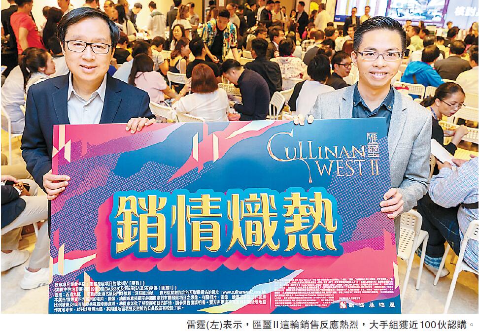 新地副董事總經理雷霆表示,本輪銷售反應熱烈,大手組獲近100伙認購。最大手的掃貨客,一組斥資近1.5億元,掃入5A座高層A、B、C室共3伙。另一組客人同樣斥資逾1.5億元,購入5伙四房單位及1伙一房單位,共6伙。大手組時段,共有97組大手客到場。B組散客中午12時30分開始登記。另外有消息指,B組時段暫售出256伙,連同A組售出96伙,佔昨日可售單位364伙的逾九成。