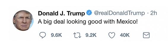 【香港商报网讯】据美国广播公司报道,本周一,美国总统特朗普正式宣布,美国正式与墨西哥就贸易问题达成协议,并弃用北美三国自由贸易协定(NAFTA)这一名称,因为他觉得旧名称不吉利。特朗普称,目前更名为美国-墨西哥自由贸易协定(United States-Mexico Free Trade Agreement)。