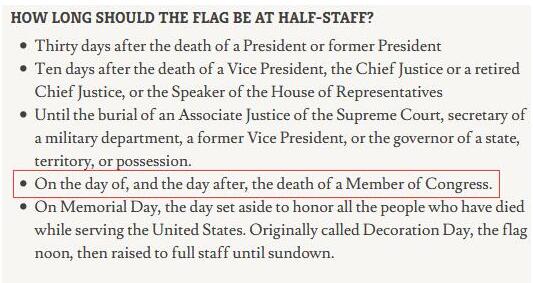 在《美国法典》第36章第10条中,对“需要降半旗”的多种情况进行列举:比如“总统级别人物”死后30天,副总统、司法部长死后10天等。