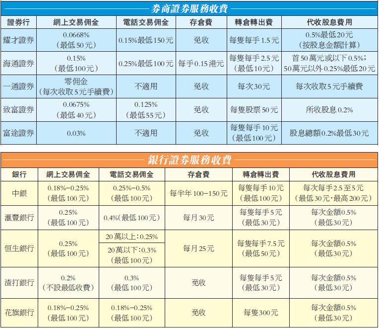 此外,不論證券行或銀行都會收取代收股息費,證券行普遍為股息的0.5%,最低收20元;銀行也差不多,恒生及汇豐均是股息的0.5%,最低收30元。