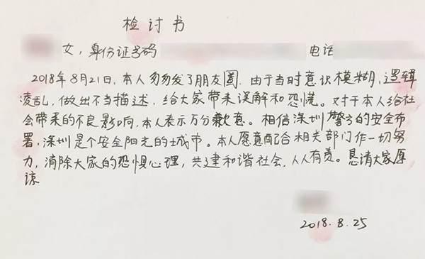 8月25日,警方对那3名男子,以涉嫌“招摇撞骗”治安拘留7天,同时也对发帖者莫某作出了处罚:“对在网络上发布与事实不符言论,扰乱公共秩序的违法行为人莫某某予以教育训诫,并处以治安罚款500元”,莫女士还被要求写了“检讨书”。