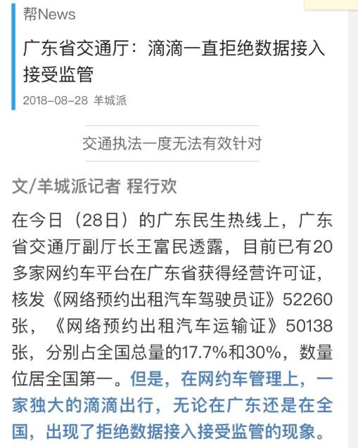 广东省交通厅:滴滴一直拒绝数据接入接受监管