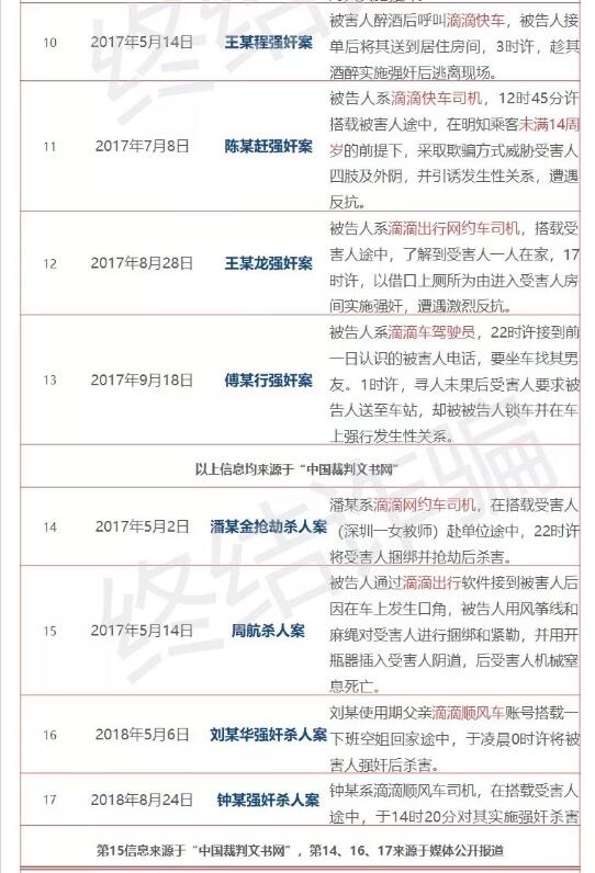 17宗涉及滴滴司机强奸、杀人案件(已判决或公告)的简表如下:
