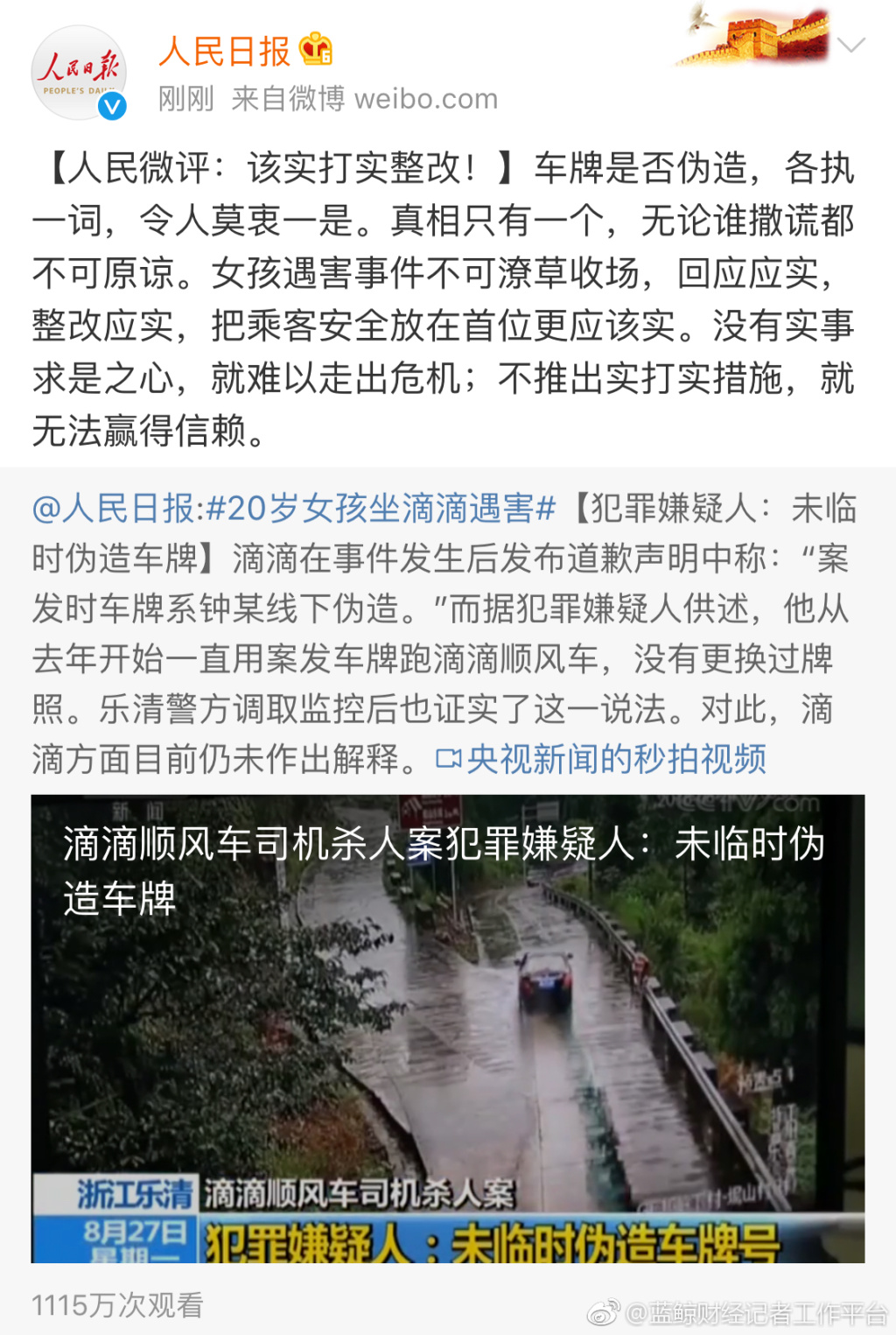 人民日报官微评论指,该实打实整改!车牌是否伪造,各执一词,令人莫衷一是。真相只有一个,无论谁撒谎都不可塬谅。女孩遇害事件不可潦草收场,回应应实,整改应实,把乘客安全放在首位更应该实。没有实事求是之心,就难以走出危机;不推出实打实措施,就无法赢得信赖。