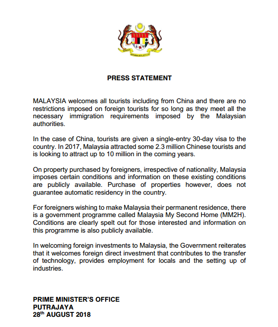 【香港商报网讯】马来西亚总理办公室于8月28日晚发布官方声明表示,马来西亚欢迎包括中国的所有国家的游客,只要他们符合马来西亚官方要求的必要规定,对外国游客没有限制。