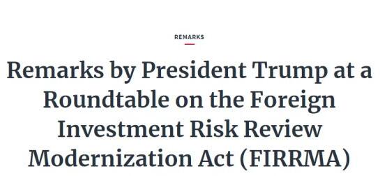 当天,特朗普向在座的美国财政部长姆努钦以及多位国会议员深表谢意,因为正是在他们的帮助下,“有助于保护美国知识产权和国家安全的”《外国投资风险审查更新法案》才得以通过。