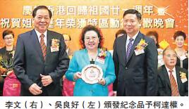隨后,諸位嘉賓為歷屆榮獲特區政府頒授勋銜的姐妹們頒發紀念品。諸位姐妹分享獲獎感受。鄭琴淵講到香港回歸之前和回歸之后,外地華人華僑的身份境遇變化,希望在外的華人華僑為祖國的穩定和繁榮作出貢獻。