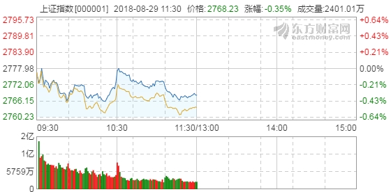 【香港商报网讯】8月29日消息,今日早盘两市低开低走,盘面热点缺乏,没有出现多股涨停的热门板块。指数水下震荡下行,盘中似有冲高,但是资金做多乏力。截止午间收盘,沪指报2768.23点,跌0.35%,深成指报8668.75点,跌0.74%,创指报1480.57点,跌0.84%。