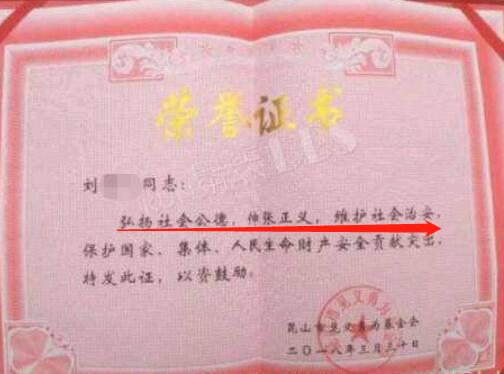 昆山市见义勇为基金会关于刘海龙的见义勇为荣誉证书情况说明