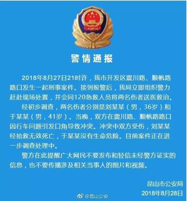 8月28日,昆山市公安局发布警情通报称,2018年8月27日日21时许,昆山市开发区震川路、顺帆路路口发生一起刑事案件。接到报警后,昆山市公安局立即组织警力赶赴现场处置,并会同120急救人员将两名伤者送医救治。