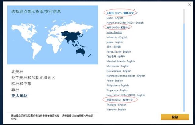 在美联航官网页面中点击语言一栏(上图红色箭头处),“亚太地区”里,原本应该出现的“中国大陆(内地)”、“中国香港”和“中国台湾”居然被“人民币(CNY)-简体中文”“港幣(HKD)-繁體中文”“新臺幣(NTD)-繁體中文”的标注所代替,而其他国家的语言栏则均以国名标注,只有中国特殊↓