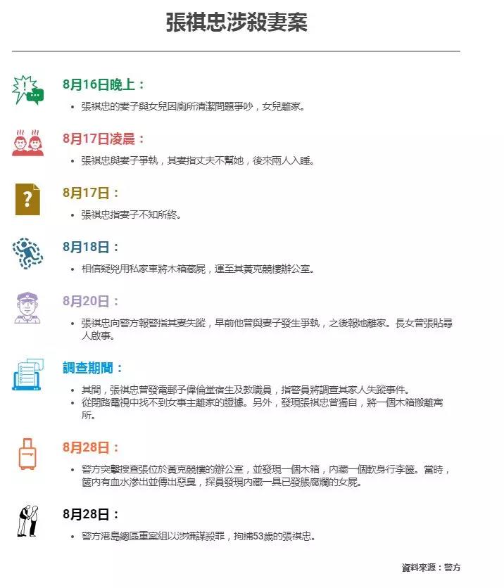 據悉,死者的胞妹在暑假期間從英國來港並一直住在死者家中,當晚她亦聽到死者與女兒爭執聲,翌日早上她離港返回英國前,曾因不見死者露面而感到有異,當時張祺忠答她死者已離開寓所。