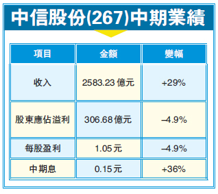 業績方面,中信股份截至今年6月底止,中期純利按年減少4.9%,至306.68億元;若扣除期內54億元投資重估收益,以及人民幣兌港元匯率影響,上半年的實際利潤應同比增長6%,派中期息每股0.15元,較去年同期增多36%。常振明期望,未來可持續增加派息,以順應國資委的要求。