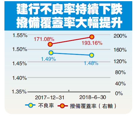 建行的不良貸款率、撥備覆蓋率和資本充足率一直處於較佳水平,今年上半年的不良貸款率為1.48%,較上年末下降0.01個百分點。首席風險官廖林表示,銀行的貸款質量仍然穩中向好,不良貸款率會持續改善,相信趨勢在未來一定時期內不會改變。