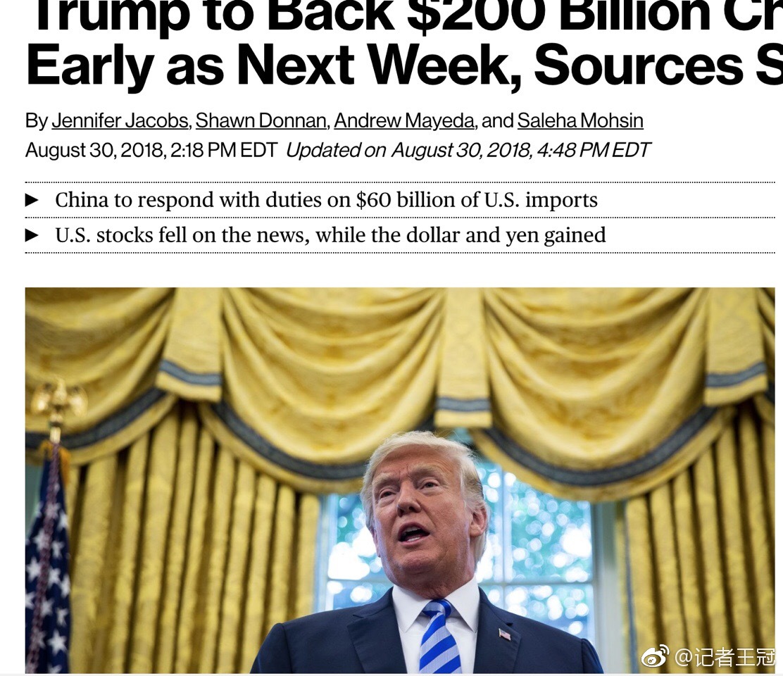 另外,@记者王冠发表题为“6名幕僚:特朗普想下周起对华征2000亿关税”的微博指,经常拿到白宫“喂料”的彭博社援引6名“知情人士”报道称,特朗普希望在9月6日公示听证期结束后,开始推进对华2000亿加征关税计划,从10%到25%不等。周四在白宫被问真假,特朗普本人笑着说“不是完全错误”(not totally wrong)。但6人中也有人称特朗普还没做出最后决定,美方可能会分批次加征。白宫故意漏题、利用媒体制造舆论给谈判对手施压的做法屡见不鲜。问题是:谁手里真正的牌更硬。