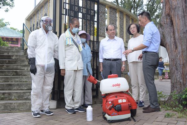 在忠義亭,有食環署職員示範用滅蚊噴霧機滅蚊,又向張建宗與陳肇始講解噴霧機的功用及限制等。長洲官立中學校長陳耀明表示,校方已成立了防蚊滅蚊督導委員會,除了教職員,學生都會參與委員會工作,協助校方滅蚊。他又說,部分原本於戶外進行的活動,如早會、體育課等,開學後將會移師至室內,另外,女學生亦不必穿裙上課。