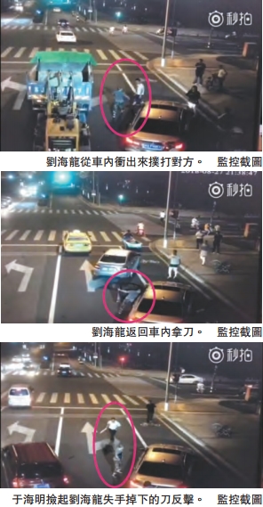 劉某某先下車與于海明發生爭執,經同行人員勸解返回車輛時,劉海龍突然下車,上前推搡、踢打于海明。雖經勸架,劉海龍仍持續追打,後返回寶馬轎車取出一把砍刀(經鑒定,該刀為尖角雙面開刃,全長59厘米,其中刀身長43厘米、寬5厘米,係管制刀具),連續用刀擊打于海明頸部、腰部、腿部。擊打中砍刀甩脫,于海明搶到砍刀,並在爭奪中捅刺劉海龍腹部、臀部,砍擊右胸、左肩、左肘,刺砍過程持續7秒。劉海龍受傷後跑向寶馬轎車,于海明繼續追砍2刀均未砍中,其中1刀砍中汽車。