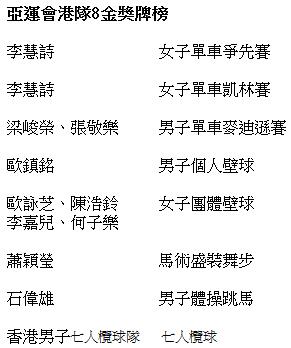 今屆亞運會上,港隊在一些傳統項目上繼續保持強勢,例如「牛下女車神」李慧詩表現神勇,分別於凱琳賽及爭先賽勇奪金牌,單車隊亦是金牌大戶;面對傷患的石偉雄成功衛冕跳馬金牌,連續兩屆亞運摘金而回。在弱項上香港運動員也取得突破,包括壁球隊在男子個人賽包辦金牌和銀牌;馬術隊獲得史上首個亞運金牌;七人欖球隊奪得歷來首枚團隊運動金牌,當然也不會忘記男子花劍隊以兩面銀牌成歷屆最佳,呂麗瑤女子100米跨欄勇奪銅牌改寫香港田徑歷史,等等。港隊取得令人矚目的成績,不斷創造奇迹,讓港人感到自豪,為之歡呼,而運動員們挑戰體能極限,付出無數汗水,在超強磨練下堅毅不屈,在艱苦賽事中力爭向上,無論是否得到獎牌,都值得市民的支持和肯定。