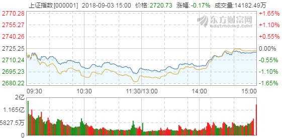 【香港商报网讯】 9月3日消息,今日三大股指上演深“V”走势,沪指跌幅收窄,军工、软件股活跃,带动创业板指回升成功翻红。乐视网今日再次封板涨停,自8月20日股价见底后,10个交易日累计涨幅超64%。截止收盘,沪指报2720.73点,跌幅0.17%,深成指报8455.55点,跌幅0.12%;创指报1443.69点,涨幅0.59%。