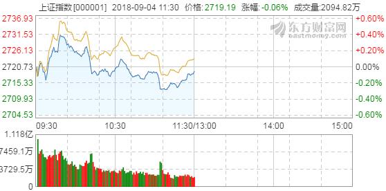 【香港商报网讯】9月4日消息,沪深两市今日小幅低开,随后开盘积极上攻,可惜持续性不佳,整体呈冲高回落走势,临近午盘再度下挫。截止午间收盘,沪指报2719.19点,跌幅0.06%,深成指报8443.62点,跌幅0.14%;创指报1435.76点,跌幅0.55%。
