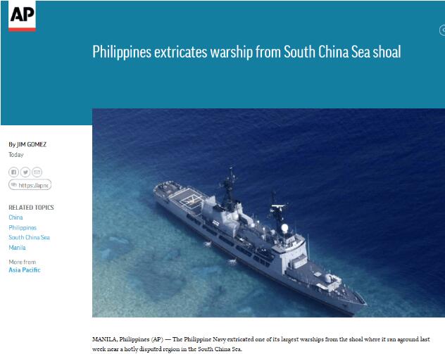 报道还称,这两名菲律宾官员以匿名身份告诉美联社,菲律宾海军护卫舰在浅滩意外搁浅后,菲律宾国防部官员通知了中国官员,以避免产生任何误会。