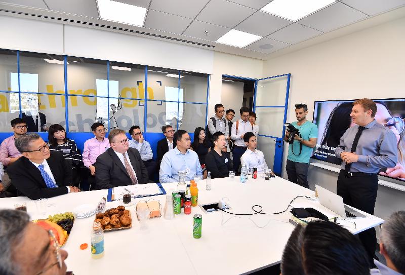 財政司司長陳茂波(前排左一)昨日(以色列時間九月四日)在耶路撒冷參觀一間專門研發人工視覺技術產品公司,了解該公司在科研成果商品化的情況。(香港政府新闻网)