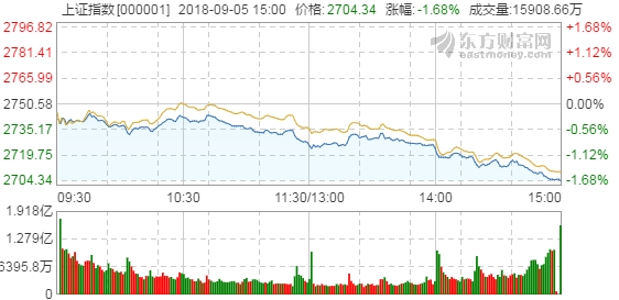 【香港商报网讯】9月5日消息,周三两市小幅低开,沪指随后展开低位震荡,午后,白酒、银行等权重股加速下跌,沪指受其拖累,跌幅逐渐扩大,深成指和创业板指紧跟沪指走势,跌幅均逾1%。截至收盘,沪指报2704.34点,险守2700,跌幅1.68%,深成指报8402.51点,跌幅1.78%,创业板指报1430.2点,跌幅1.74%。