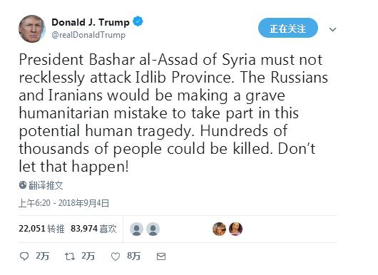特朗普:“叙利亚的巴沙尔总统不应该鲁莽地对伊德利卜省发动进攻。俄罗斯人和伊朗人可能会参与这场人类的悲剧之中并犯下人道主义错误。数十万的人会被杀害,别让这一幕发生!”
