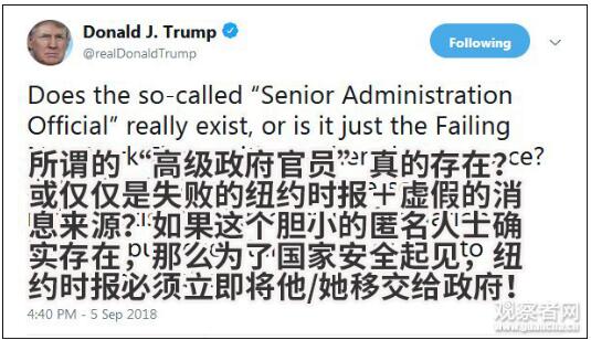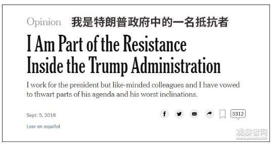 当天,特朗普身边的一名神秘高官在《纽约时报》上发表了一篇文章:《我是特朗普政府中的一名抵抗者》。