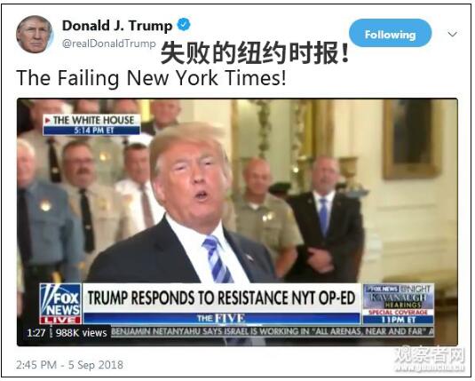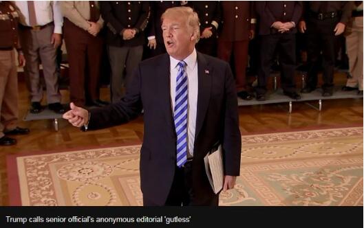 同一天下午,特朗普在白宫的一场活动上超级生气,他对着镜头说:“如果失败的《纽约时报》发表了匿名社论,你们会相信吗?匿名意味着胆小,一篇胆小的社论。”