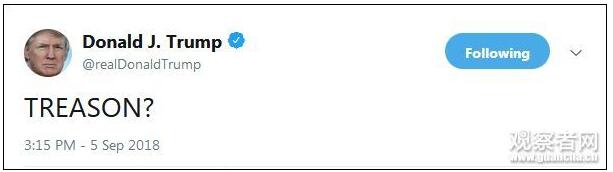 气得特朗普,5日一整个下午都在发推特,一会儿气得只打了一个词:“谋反?”一会儿说要《纽约时报》把这个胆小的匿名者交给政府。