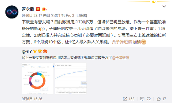 9月6日晚,快如科技(子弹短信运营主体)早期投资人、锤子科技CEO罗永浩在微博表示,目前子弹短信的激活用户700多万,但增长已明显放缓。