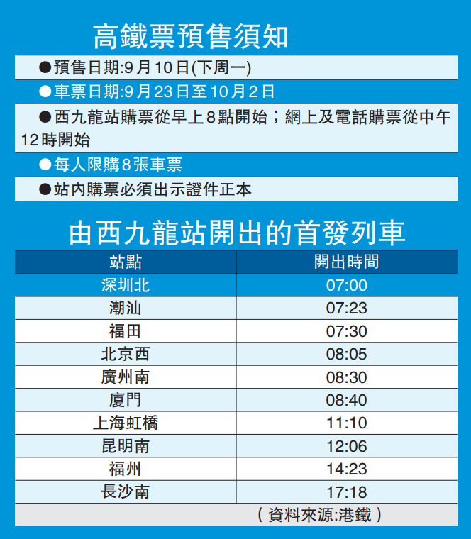 港鐵車務總監劉天成在西九高鐵總站舉行的記者會上指出,下周一當日只預售10日的車票,即23日至10月2日的車票。不論任何途徑購買,預售期間每人限購8張,來回車票等同兩張。